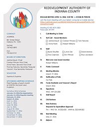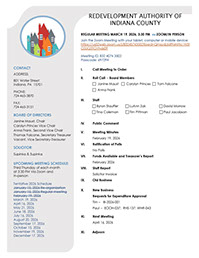 The monthly Indiana County Redevelopment Authority public meeting convenes every 3rd Thursday via Zoom until further notice.