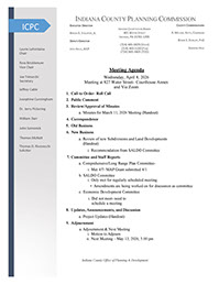 The monthly Indiana County Planning Commission public meeting convenes every 2nd Wednesday via Zoom until further notice.