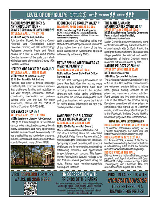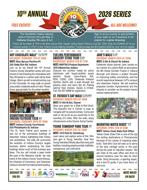 Prizes will be drawn at 1PM in the Blue Spruce Park Gazebo during Nature Palooza June 6th, 2026. SIGN UP at in-person events or POST on the “Indiana County Walking Decathlon” Facebook page with #ICDecathlon2026 by June 1st to be eligible.